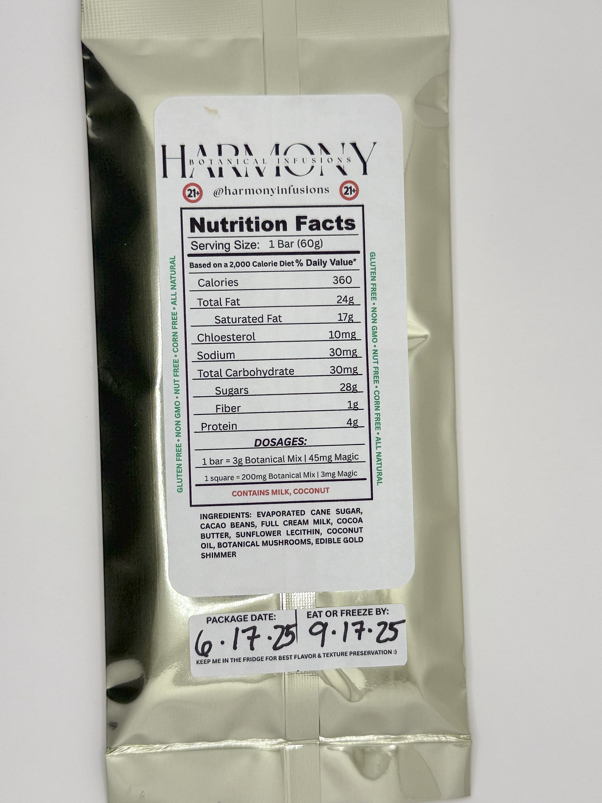 Evaporated Cane Sugar, Cacao Beans, Full Cream Milk, Cocoa Butter, Sunflower Lecithin, Coconut Oil, Magic Mushrooms, Edible Mica (Gold Shimmer)